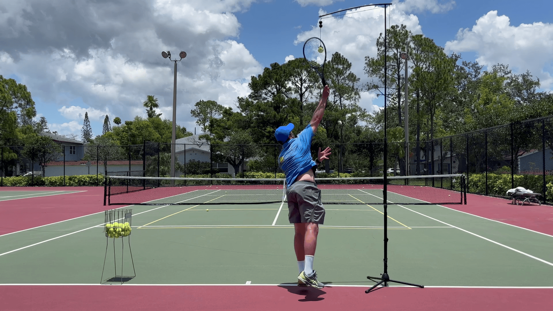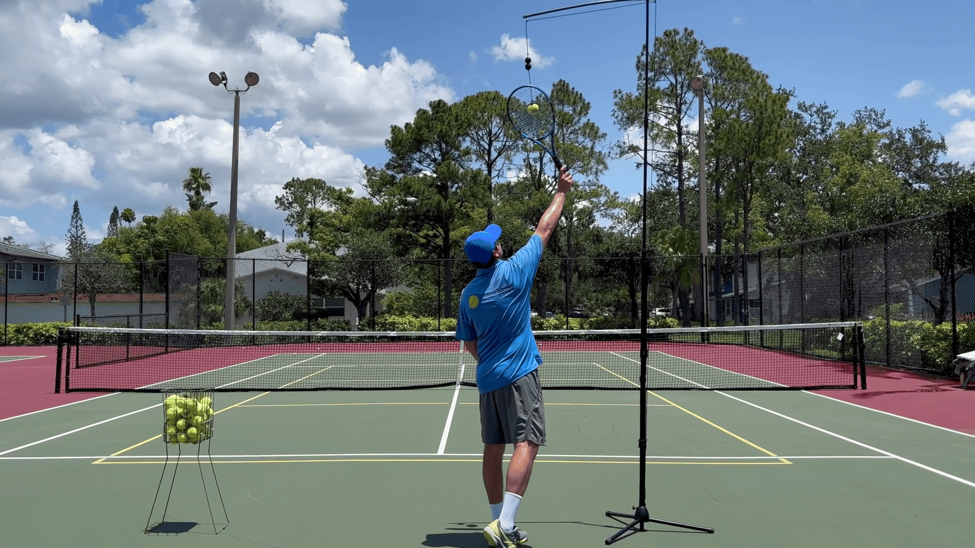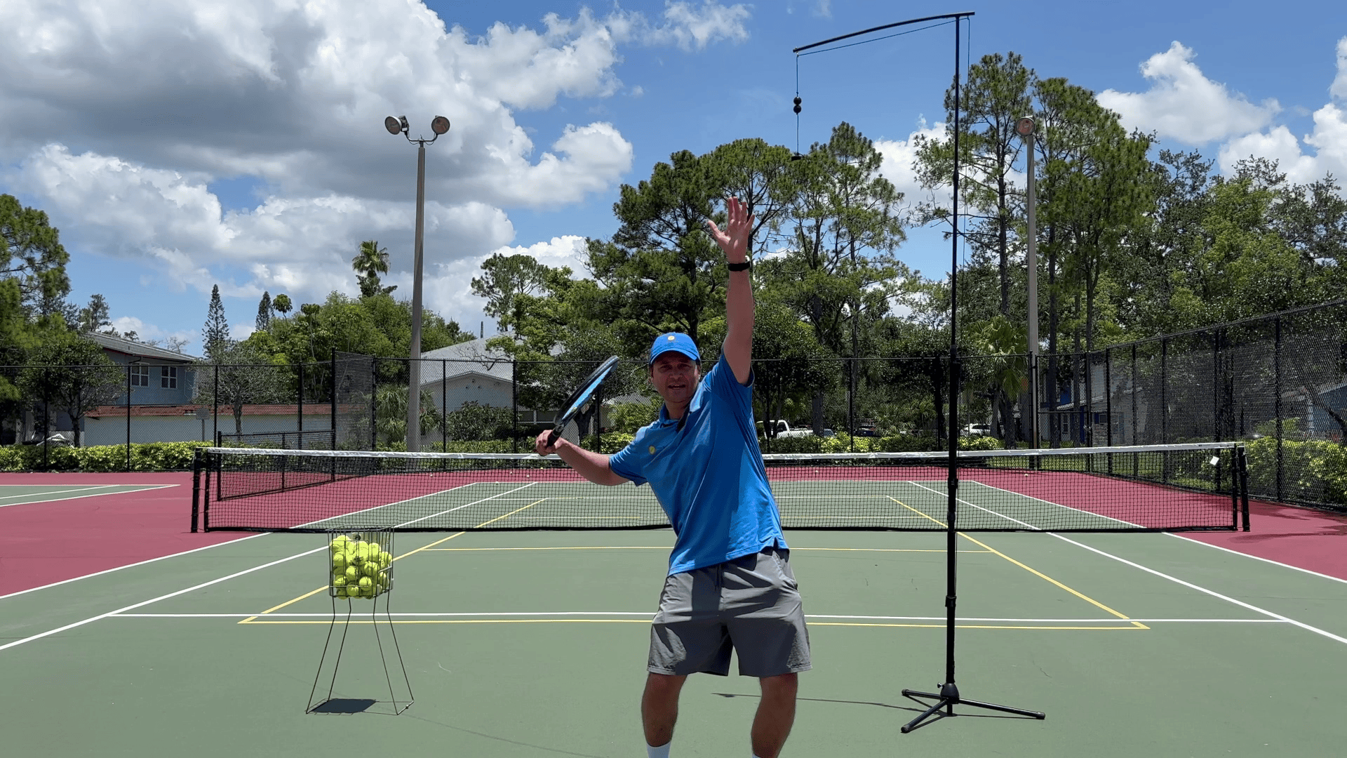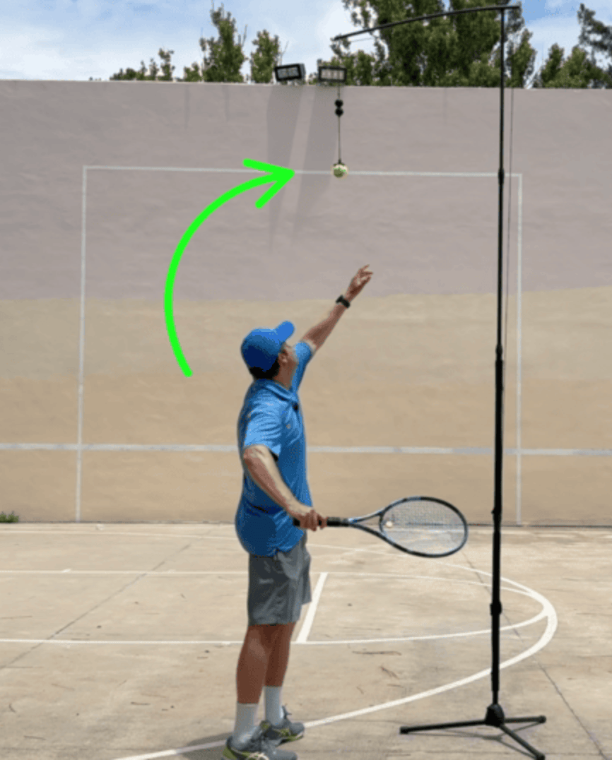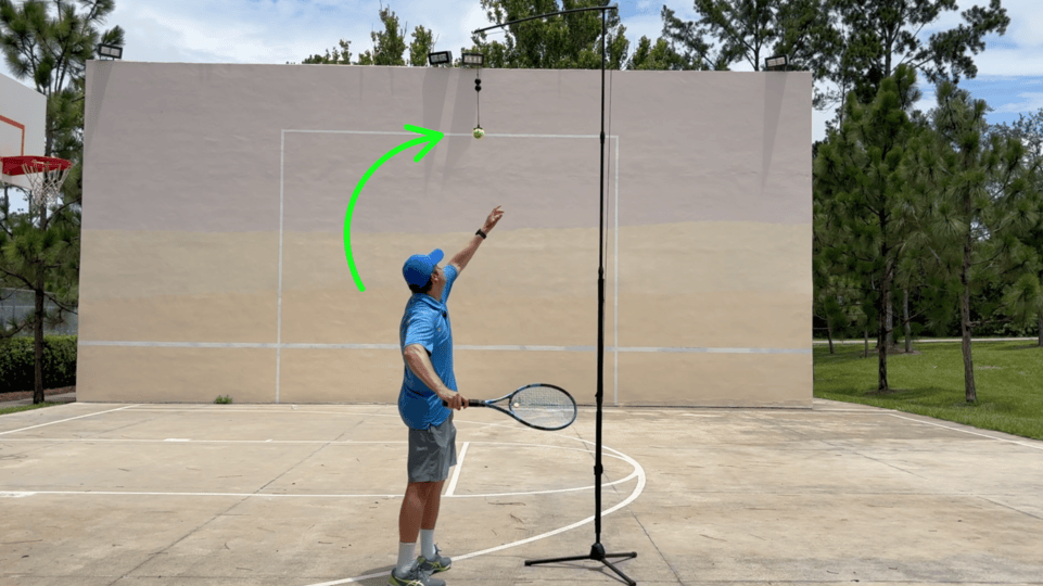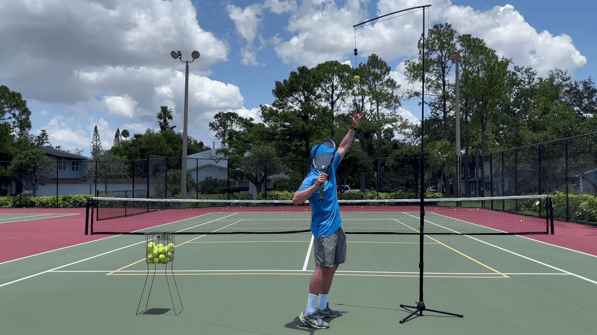 It gives you a stationary ball to hit — so you can finally experience hitting with your new serve technique but without having to coordinate the toss and the hit at the same time just yet.