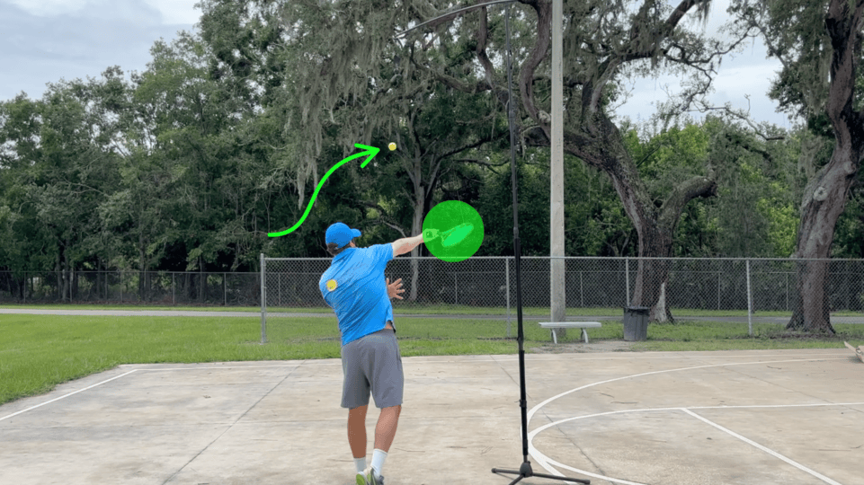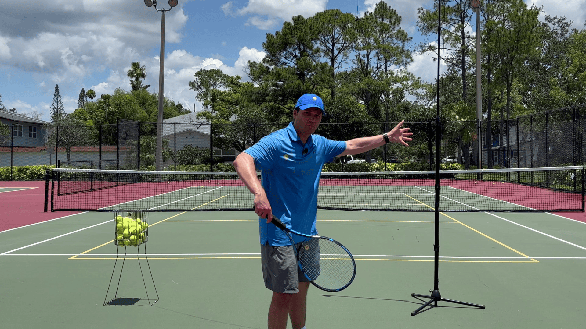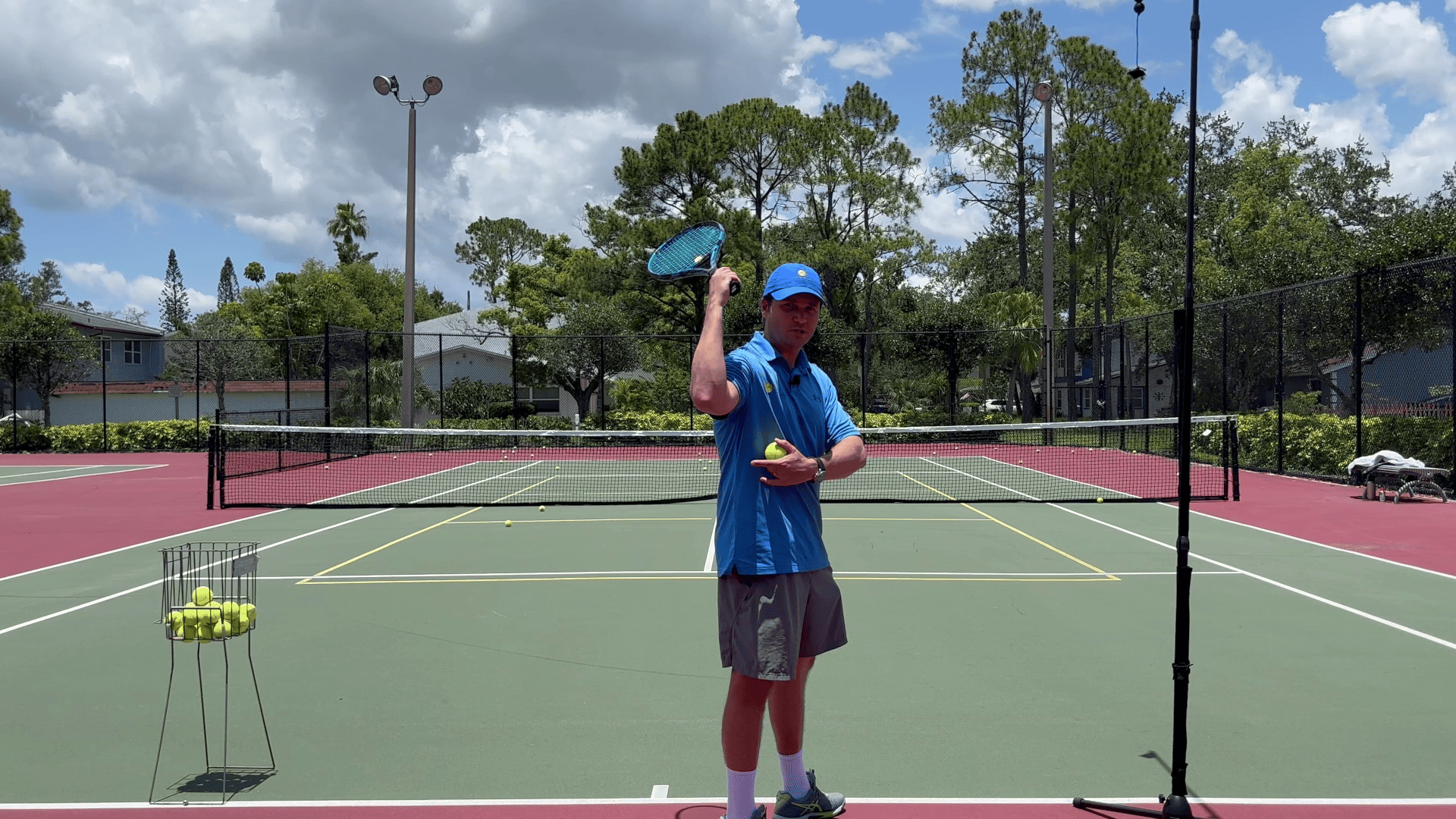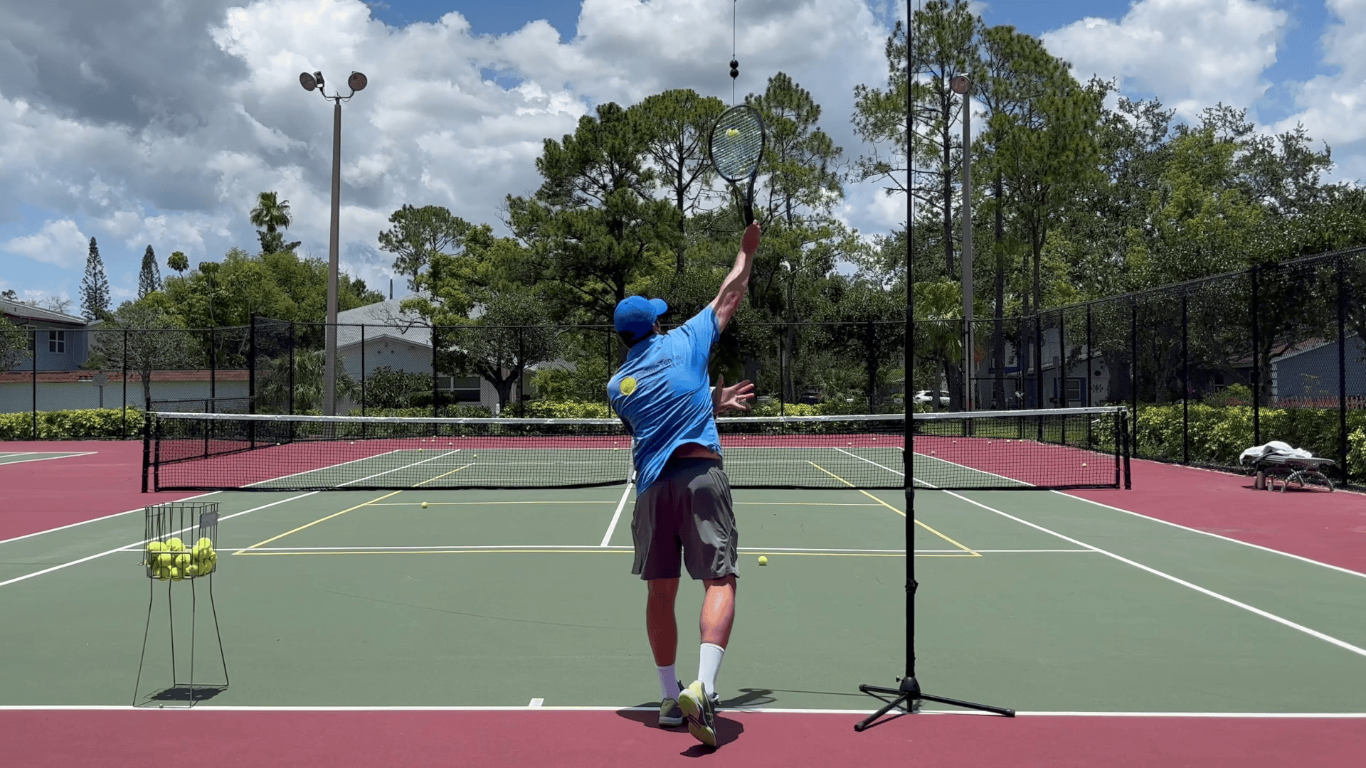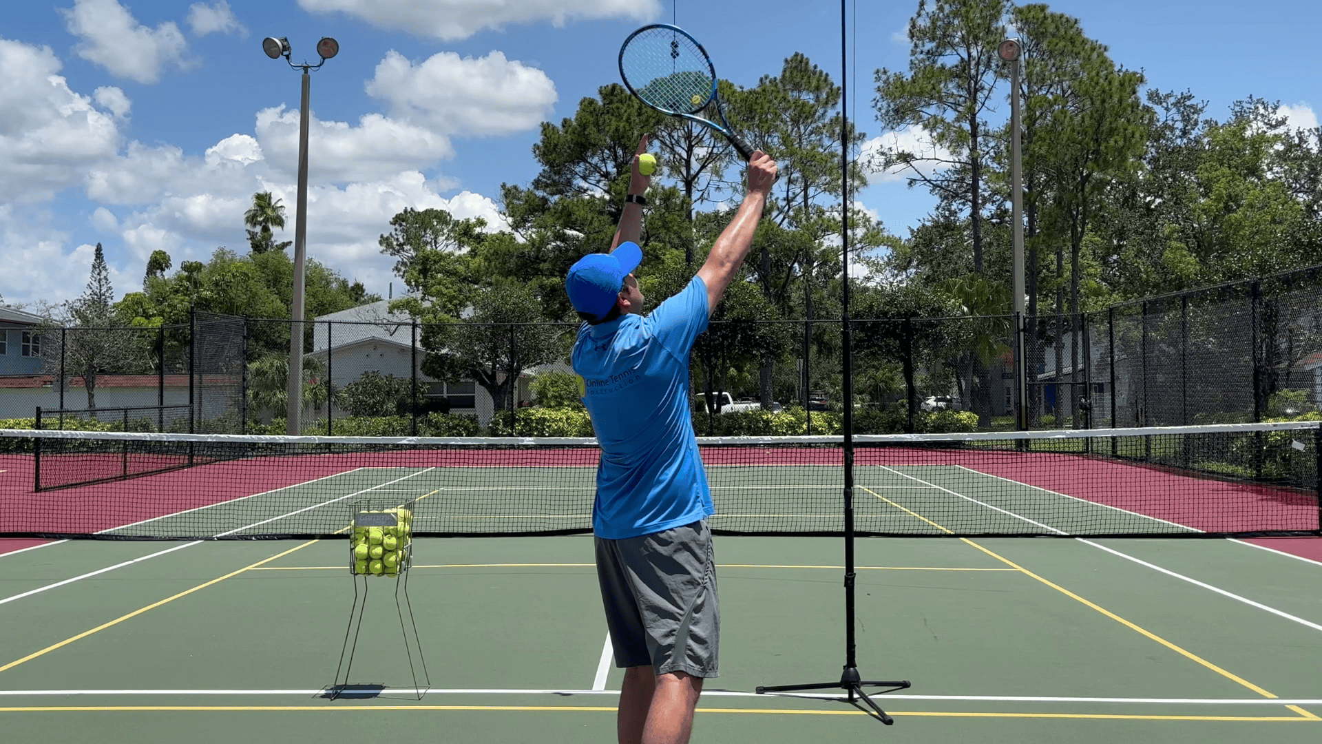 It gives you a stationary ball to hit — so you can finally experience hitting with your new serve technique but without having to coordinate the toss and the hit at the same time just yet.