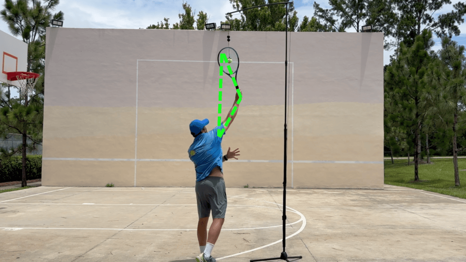 The OTI Serve Stand bridges the gap between shadow swings and real serves by allowing you to develop new muscle memory while hitting correct serves.